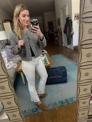 I saw this whole look on RTR and had to rent it. I loved the causal, preppy vibe. These are one of the few cropped jeans that actually worked for me as a petite person. They have a good stretch as well. It was recommended to size up and I did. The fit was perfect.