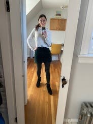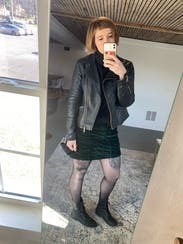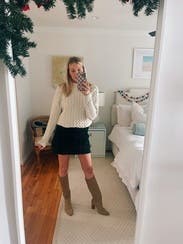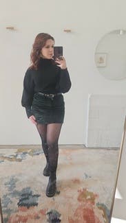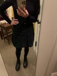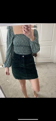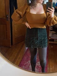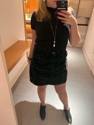 Loving this skirt for the holiday season and mini skirts in general. The dark green velvet felt very festive and the fit was spot on. I'm 5'8 and it's not too short. Wore with a chunky sweater and boots for lunch with a friend and an early dinner, then paired with tights and a turtleneck to church. Follow @confessionsofarentaholic for more!