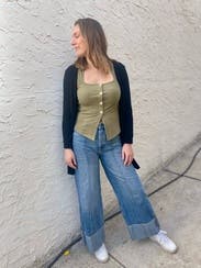 These DL1961 wide-leg jeans offer a contemporary twist on classic denim with a contrasting cuff detail. Pair them with a fitted top to balance the voluminous silhouette and add heeled sandals for an elevated casual look.