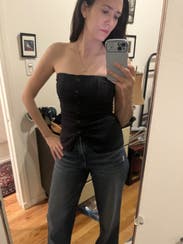 Pair this top with a pair of jeans for a easy, chic look. I wore it with a strapless bra.