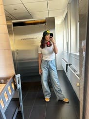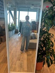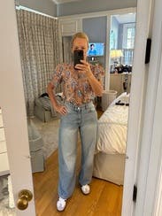 I usually flux between a 25-26 depending on the brand and fit of the jean, but went with the 25 here and felt it fit comfortably (there is slight room left in the waist), so I would say these jeans fit a little bit on the larger side. I can also tell that with more wears they will probably continue to loosen a bit, so I likely could’ve sized down. I’m also 5’1 and these jeans were very long on me- I cuffed them to make them petite friendly, but petite girls beware. I could probably get away with wearing them normally with a pair of heels. The wash of the jeans is so pretty! I paired them with a plain tee, oversized blazer and fun pair of flats for the office. Despite the larger/longer fit, these are still such a gem!