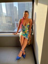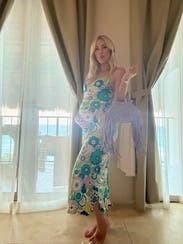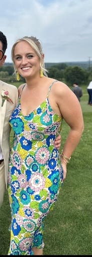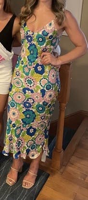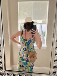 The colors and pattern of this dress are amazing. I got so many complements every time I wore it. Because the style is pretty simple, you can dress it up or down with shoes and accessories. I would definitely rent again! I also rented the copper floral pattern of this dress before and both are incredible.