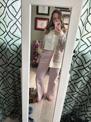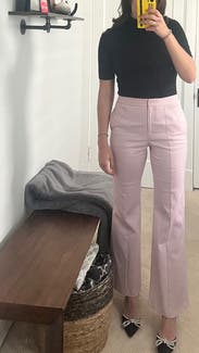Great fit, beautiful lavender color, and quality material. I love the flared leg. I wore it with a black, mock turtleneck, short sleeve, fitted top, and black, platform, high-heel sandals. I also wore them with a sleeveless, tank top. I received many compliments and would rent them again.