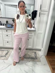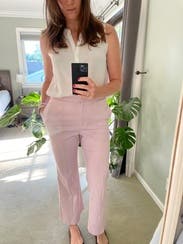 These pants are one of my favorite! They’re good quality, great cut, and a beautiful pink color that isn’t too flashy but stands out. They are mid rise and slightly boot cut. I wore with a cream shirt and a black and white patterned shirt for a conference. They do run slightly large. I thought this size 4 fit more like a 6