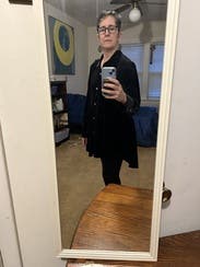 Wore this to a networking event with stockings. I liked the look of it, though the sleeves were a bit long, and it runs big in general.