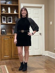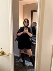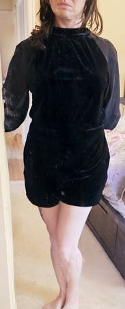I love the velvet and sheer sleeves of this romper. Many compliments. It’s loose in the waist, which is partly what makes it comfy. I might try it again in the future sized down to see if that’s more flattering, but it looked good even when loose.