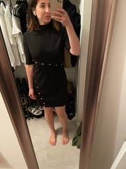 This black dress is effortlessly flattering. The gold button detail adds a modern edge while slimming the waist. Comfortable, polished, and versatile—perfect for both work and evening wear. Serious closet keeper.