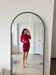 Red crepe (96% Polyester, 4% Spandex). Sheath. Long sleeves. Crewneck. Back zipper closure. 36.5" from shoulder to hemline. Imported.