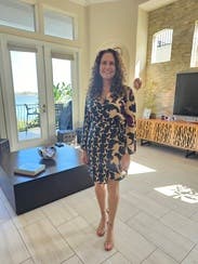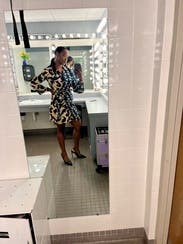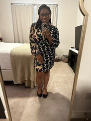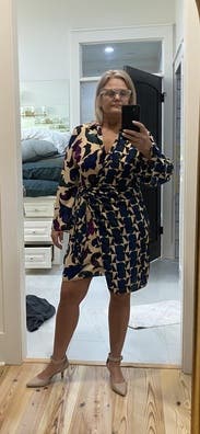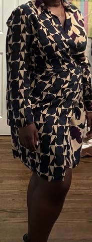 I added a small extender to the inside button connection, which gave me the inch of breathing room. I needed to make this dress truly comfortable on my body. I was incredibly impressed with the look and how flattering it was. I did not have issues with the dress coming too far apart at the top as others have noted I am a bit smaller in my chest, than I am at my hips and I like how the dress flattered my figure. If you are standing a lot, the stress will be just fine if you are sitting down, be prepared as the dress length can be problematic if you’re not prepared also the split nature of the skirt because of the rap style can expose more of one leg than just the hem line suggests. I wore the dress as a speaker at an executive conference, and I loved how fashionable and professional I looked and felt in the dress. Considering purchasing, even though the dress becomes quite short when sitting.