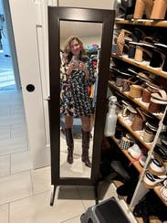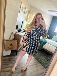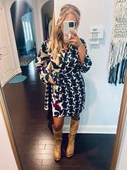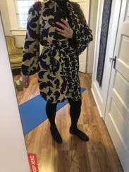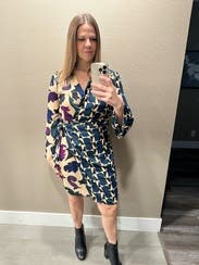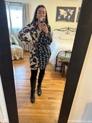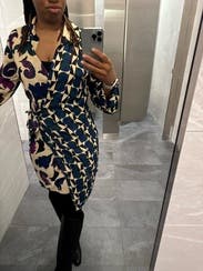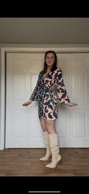 I loved this as a layer over a thick turtleneck and tights! Didn’t have to worry about the wrap sliding around. Lots of different ways to wear this dress.