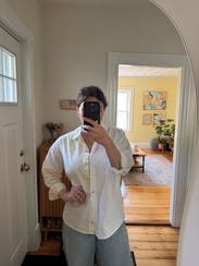 Really liked this! 1– yellow is my favorite color and 2– I like an oversized fit. I left the bottom few buttons undone to give it even more flow. Wore to work and to run a few errands. Will rent again. *4 stars because this is wrinklyyyy but it still felt out together. This photo is after I steamed it a few times.