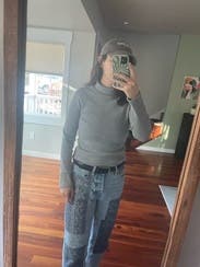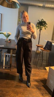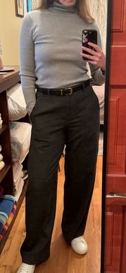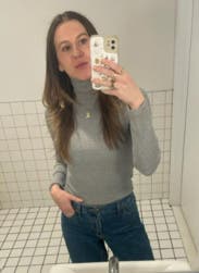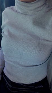 I loved this turtleneck! The fabric is great, a comfortable cotton blend, heavier than a tee turtleneck, but not quite sweater weight. It was perfect for a weekend that fluctuated between the 40s and 60s (under a jacket for the lower temps!) without feeling too warm indoors. The S that I rented was snug without being tight, but there’s plenty of stretch if you want a tighter fit. The length is a touch on the short side, which was fine for me, but might give more of a cropped impression if you’re tall. I paired it with a long black denim skirt for a dinner where I wanted to look nice but not too dressy, but this top could dress up or down easily. The color is a nice silvery grey in person, but not actually metallic.