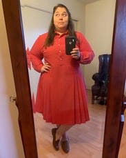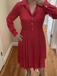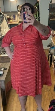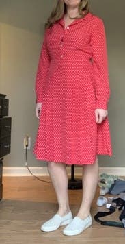 Rented this because I've been listening to a lot of Leon Bridges and wanted to rent some polka dot dresses. It fit beautifully, though I did have to pin the bust on one button. None of the belts I tried on with it really looked right. I think it would look better with the right belt though. This is silk and very light weight. Side zipper, and fit TTS. Gave it 4 stars because it was pretty and simple, nothing amazing about it though.