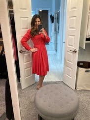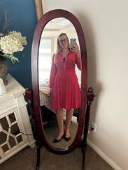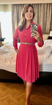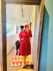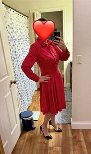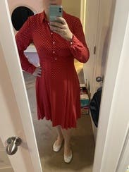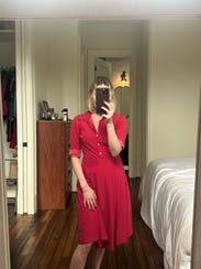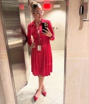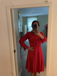 I specifically was looking for a red dress that could transition from office to a show. The pleats on this dress fell soooo beautifully, but unfortunately the bust was too tight so one button was pulling which made me a little self conscious—I’m busty though.