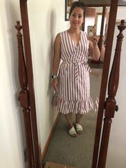Easy to wear and adjust to your size. Perfect summer day dress. Very classic with the strip that has a slightly faded look. Relaxing yet chic.