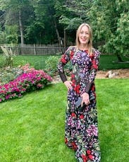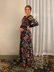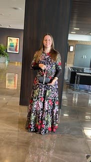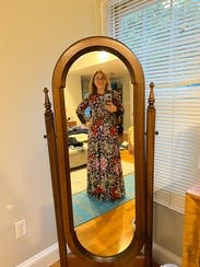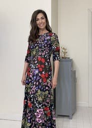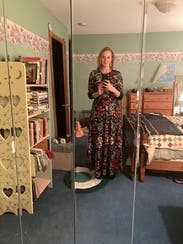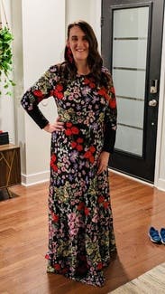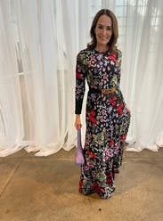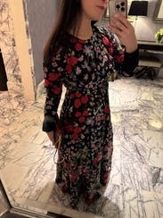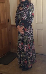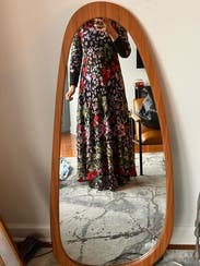 The event was held out of doors so I would be standing in wet grass. I wore boots and it worked perfectly. I would definitely suggest a belt to break-up the rather busy print. The flowers absolutely pop much more than the photo suggests. I can’t tell you how many compliments I received. I told everyone “Rent the Runway”! One suggestion I would like to make to the company. More dresses for older women. I’m 70 and VERY few dresses in your catalog would work for me.
