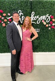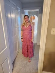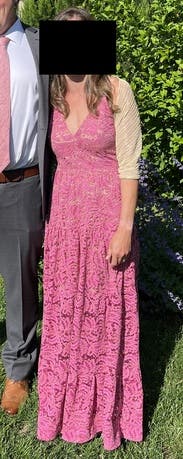 Obsessed w this dress.. rented it in the light blue before but the pink was Wow! It’s got gold in it up close which makes it feel so unique without being over the top! Could totally work for any dress code at a wedding. Fit TTS. I’m 5’5” and wore 3in heels and it was the perfect length.