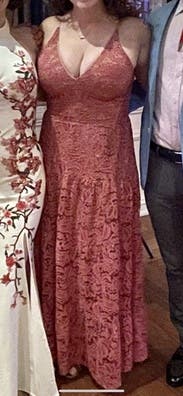 Such a pretty dress, I had multiple strangers come up to me and compliment the dress! It’s even more beautiful in person with the gold accents. The nude slip doesn’t go down the whole way, so just make sure it doesn’t ride up when you sit! I am 5 ft 6 and wore 2 inch heels and it was a tad long but I managed! I am a 34c and was worried the XS would be too small but it was the only size left. I usually wear a small but the XS fit and zipped up fine but it was a tight fit at the bust.