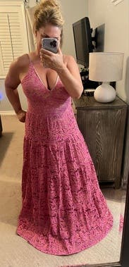 I loved everything about this dress. It fit perfectly; allowed for some cleavage without being too much. It may be a bit tight with a bigger bust. I had small heels on and while the length ended up fine every once in a while when I was walking my heel would get stuck in the lace.