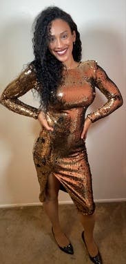 I chose this Dress the Population gold sequin dress for our 2022 winter family photoshoot. It was soft as a silk in the inside. No itchy sequin feeling. It had a good stretch while still staying form-fitting to my body. I’m 5’2”/133 lbs/34A bust and a small fit lovely. 10/10 would recommend for NYE party, wedding, etc! Loved it! ✨