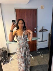 I wore this to a wedding rehearsal and dinner, paired with cork wedges. It could have been dresses up with heels or down with sandals. The app sized me as a Small but it wouldn't zip – the Medium barely zipped but we made it work! Size up.