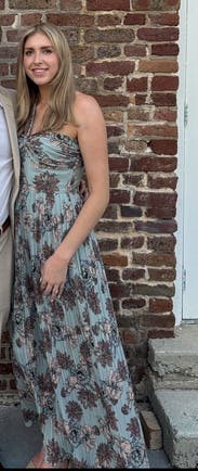 This dress is so comfortable, so flattering, and has a perfect fit. The muted, dreamy colors are what drew me to this dress. The length was perfect for me and I am 5’9. Wish I had more formal affairs to go to because I’d keep it for sure. Hate sending it back! The fit is slightly small. If you are a size 6 you might want to size up to a medium.