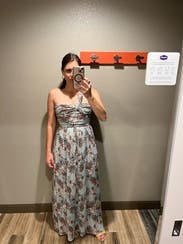 Thank goodness for this dress because my original choice wasn’t for me. This is so versatile- can be dressed up or down! I’m 5’1” and wore 4.5” heels in order for this not to drag on the ground. The corset top was shaping but comfortable and the pleats were slimming. This was a fun and easy rental! I chose to wear a 4 for comfort. True to size!