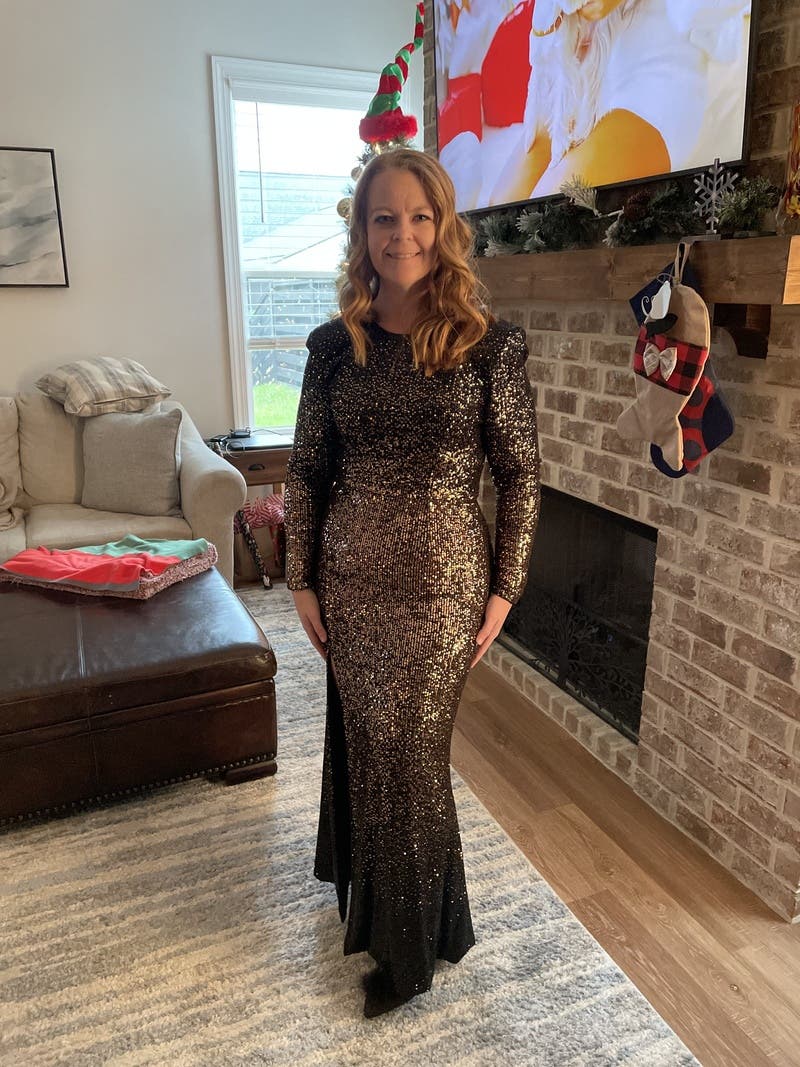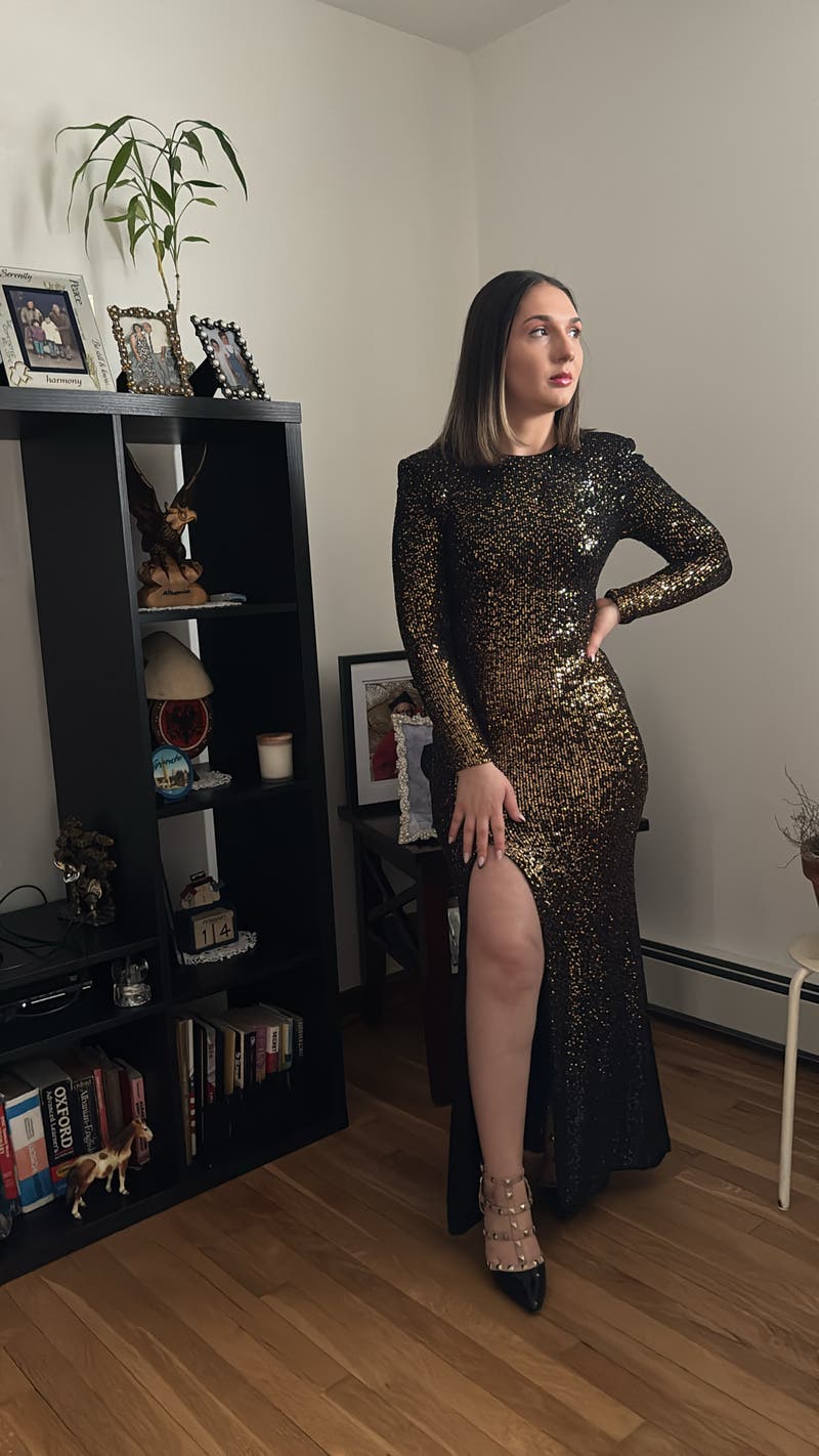 Black & Gold Sequin (95% Polyester, 5% Spandex) Column gown. Long Sleeve. Back zipper closure. 58" shoulder to hemline length. Imported.