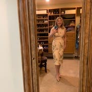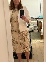 This floral dress was comfortable. It created a nice silhouette. The base color is more of a yellow tinge than a cream or white. Fit just right