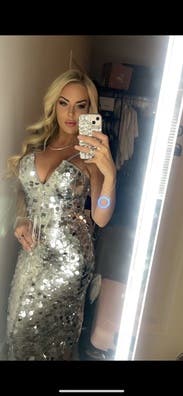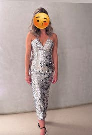 Wore this to a silver themed benefit and got complements all night. It’s very booby (!) and definitely a tight squeeze, but from a few feet away the sequins hide a multitude of sins!