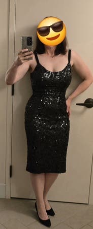 i wore this to a wedding and felt amazing in it! i think it accentuated all the right areas. the sequins didn’t scratch my arms. i wore a small, i’m 125 lbs, 27.5 in waist, 34B