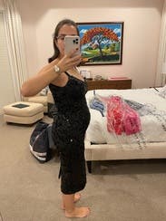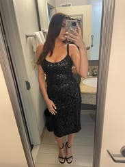 Wore this dress at a semi-formal rehearsal dinner while 21 weeks pregnant. The small was a tad too tight (especially around the upper body), so the medium ended up being the perfect fit. It had enough stretch to fit the bump and pregnancy weight without issues (usually around 140, but was about 155 at this point). The adjustable straps also made for an easier fit. Was able to wear shapewear and a strapless bra underneath without issue. Loved that this was a fun little black dress! Would rent again.