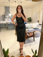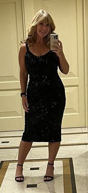 This dress fit so well - I got so many compliments during the evening. It is stretchy and comfortable, straps are adjustable. Material is thick and forgiving. I was concerned the sequins would bother under my arms but they didn’t. Generally wear a 6, ordered a small and a medium - the small fit but the material buckled strangely in the back. The medium ended up working well. A fantastic dress!