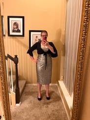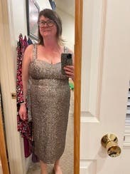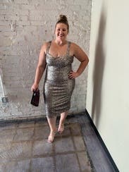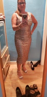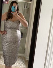 I wore it to a wedding and was trying to decide between sizes. I ended up going with the smaller size and I'm glad I did because the leg area of the dress stretched out with wear. The dress doesn't seem as flashy from the model photos but it is covered in silver sequins.