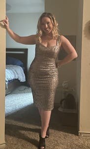 Perfect dress for a night out in Vegas. I ended up wearing the small and it was a perfect fit. Covered in silver sequins. It was a stretchy, comfortable material and I felt great all night. Great dress if you want to stand out and sparkle in the crowd!
