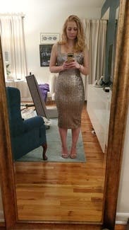 Wore this to a bachelorette which required ~sparkles~ and I'd typically order a M but it was out so I tried the S. It fit like a glove. There's great stretch and the fabric is thick enough that shapewear seams don't show. Only tricky part is the zipper which gets stuck and requires a friend to help get you in/out. Would rent again!