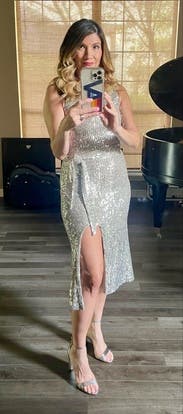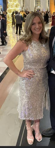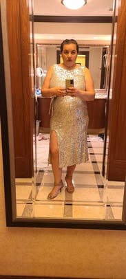 This dress fit perfectly and was so comfortable! It’s super sparkly in person. I wore it to dinner and drinks for my birthday and loved it!!