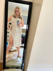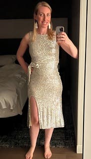 This fit me perfectly - true to size (I am a medium in most things on top and bottom; typically an 8 in pants). I felt absolutely glamorous for my birthday party in Vegas. I wore a strapless bra (but you could get away with straps easily) and styled with sparkly silver heels. I actually changed to lilac Rothy’s later in the night due to walking and those looked perfect with this dress, too. It’s versatile and comfortable.