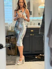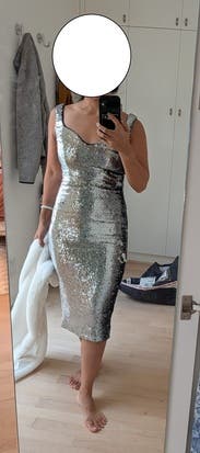 I wore this dress twice for different events. The silver sequins are luxe and the dress is cut well. I was a sparkly disco ball and loved every second in this. It fits TTS.