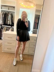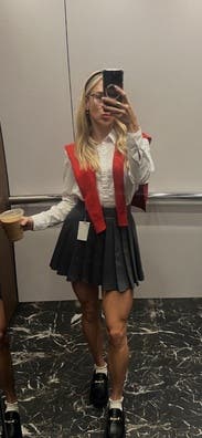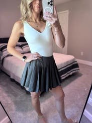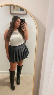 Love, love, love this pleated skirt! The built-in shorts were a total game changer and made it easy to wear all day. 🙌 I styled it so many different ways, paired with a Ronny Kobo top and sneakers for streetwear look and with a button-up and blazer for a more preppy, polished look. I usually order sizes 0-2/XS but went with a S due to the mixed reviews on this potentially running smaller. I could’ve gone with the XS, but am happy I ordered the S as it fit more snug than I was expecting, so if you’re in between sizes, maybe size up.