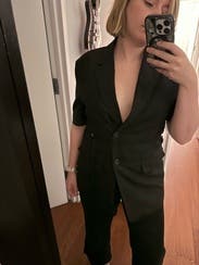 Very sexy black structured piece, loved the v and the cut of the sleeves and was surprisingly loose in the waist. Too deep for work and looked weird pinned.