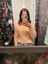 I like the pale pink color of this sweater. I got a small instead of my usual medium based on reviews saying it’s huge, but the small was on the verge of snug. It’s the perfect length, and even the sleeves aren’t too long for someone with short arms. However, it was a little bit itchy, so I didn’t love wearing it. Also, I know this is a nitpick, but I really dislike the plastic buttons. They look cheap and the yellowish tint makes them appear old or dirty.