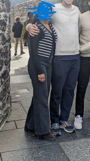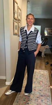 I wore these twice and got so many compliments. Loved the pin striped pants and sweater combo. Pants are stretchy and gave some vibe to them.