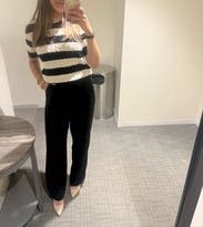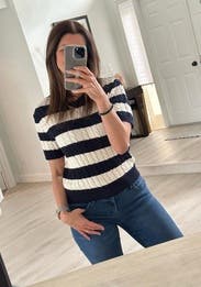I wore this a few times with jeans. It's on the shorter side so definitely shows a little tummy. Love the stripes and weight -- great top to throw on with jeans.
