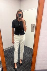 Really liked this top. The fabric is high quality and has a nice structure to it. It's not cropped but also not long, so it hit right at the waistline in a really flattering way. The one I got was missing the bottom button, so it flared out a little more than it probably should have, but it still looked good and worked just fine. You could easily dress this up with tailored pants or a skirt for work, or throw it on with jeans or linen shorts for something more casual. Great transitional piece that felt put together without trying too hard. Would rent again.