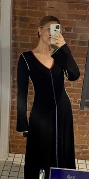 I rented this because I loved the edgy color trim. But thought that it might be too basic. Although it is a basic dress it style and fabric and the way it skims the curves is anything but basic. It has a lovely tight upper torso that moves into a gently flowing, but not overwhelming skirt.The multicolor piping has a dash of fun. I paired it with some multicolored beaded earrings that just got so much attention. Fun rental.