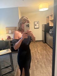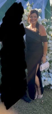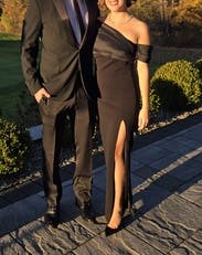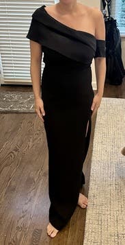 Wore to a formal wedding and got lots of compliments. Dress was true to size (I’m 5’8 and 145lbs, usually wear a 2 or 4 and I liked how the small fit on this instead of the XS). Cool asymmetrical neckline. Slit was pretty high on the left leg but not obscene. Skip the necklace and go with statement earrings with this!