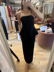 Elle Zeitoune’s Tatum Peplum Gown features a strapless, structured bodice and a architectural peplum waist over a slim column skirt. that sharpens the hourglass effect for formal occasions. Style it with block heel sandals and a sculptural clutch for a polished finish.