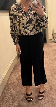 I really loved this blouse. It is excellent for summer business attire and has a nice structure at the neckline. The only thing I didn't love is that it is slightly cropped and has an elastic waistband that would ride up my back. I had to keep adjusting it. It looks very nice on video meetings.