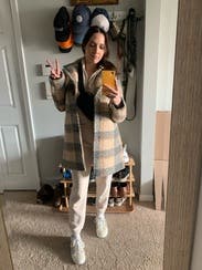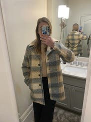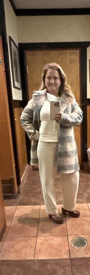 Cozy jacket! I received so many compliments wearing this out. This is a great jacket option to throw on and you can dress it up or down.
